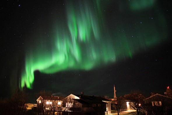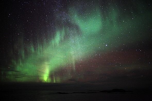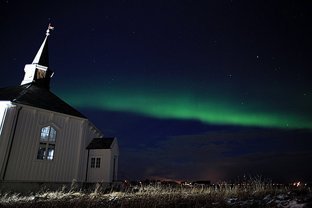 Endelig bydde det sæ en sjanse tell å knipse favorittkjerka med nordlys. Va på tur heim fra Sortland i ettermiddag da sjansen dukka opp. Ikkje fantastisk, og et vanskelig motiv sia kjerka står så nært fjærkanten på sørsia. Vidvinkel må tell før å få den med, og i tillegg står det lyskastera på nord-vest sia.
