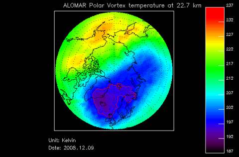 Under her ser dokker et plot fra ALOMAR som vise den artiske virvelen (Polar Vortex) som nu befinne sæ over hodan vårres i ca 20-30 km høyde i stratosfæren (der ozon-laget finnes). Det blå-aktige feltet e den virvelen. Den røde streken i det blåe vise KOR, innafør det blåe det e kaldt nok tell at …