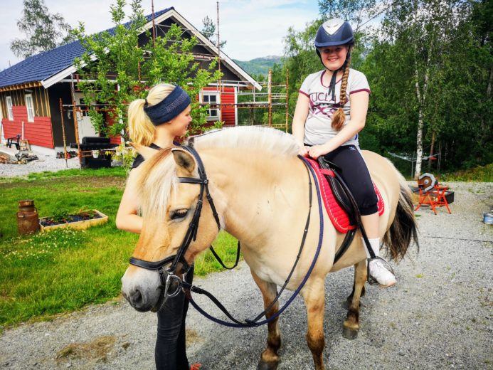I dag var det dags for Elena å få ri på hesten Dina utenfor Førde. Anna Malin har ansvaret for hesten Dina, og det var denne det handlet om nå. Stell, saling, ridning og bading med hest.