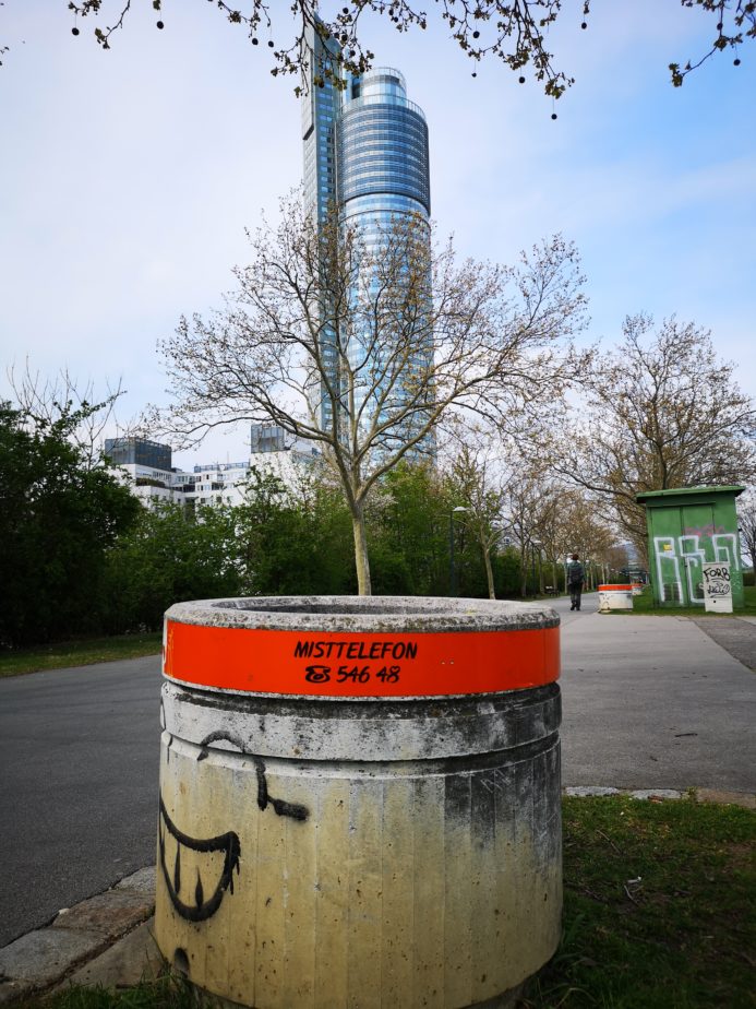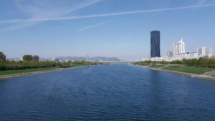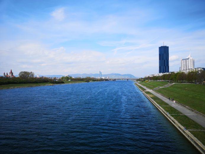 Da var dagens trim unnagjort før konferansestart om noen timer. 8 km langs Donaus bredder. Fra hotellet i sort, helt opp til ei bru ved skyskraperen i bakgrunnen, ned på venstre side til brua der bildet ble tatt, og opp langs høyre side  🙂