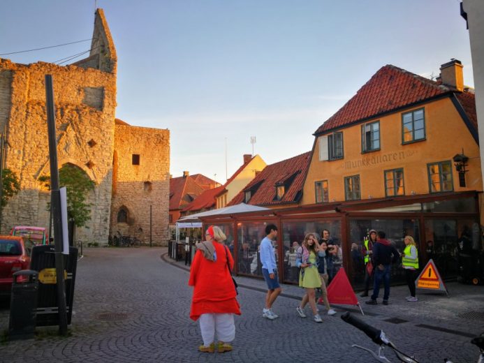Mens vi satt og spiste på en av Visbys restauranter i går kveld, kom «Maria Vern» ruslende forbi bordet. Litt for sen til å knipse det, men her er de i gang med en annen scene, få meter unna bordet vårt…