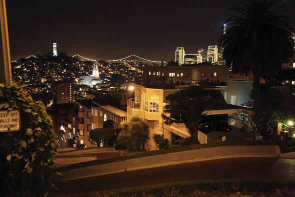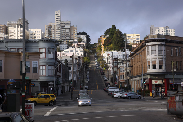 Sånn ser det ut fra toppen av «snirkelgata» i San Francisco. Den berømte gata som e så snirklat at KUN privatbila kan kjøre der. Bussa sett sæ fast, og det har skjedd. Da måtte kranbila løfte bussen ut igjen 🙂