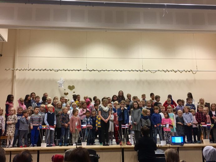 Elena sang med skolekoret under åpen dag i går. Ho står oppe til venstre i bakre rekke 🙂