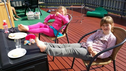 Elena og ho Jessika cooler’n på verandaen med bolla. Legg merke tell de små variantan under den lille parasollen 🙂