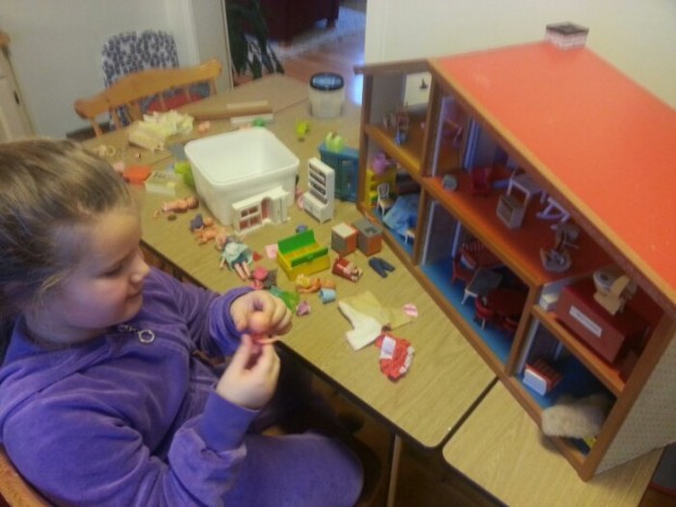 Elena i lekinga med dukkehuset på Dverberg