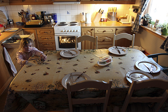 I dag va ho også syk, men ikkje dårligare enn at ho skulle dekke på middagsbordet. Æ leita frem tallerkna som sto i en stabel på benken. Etter det måtte æ en tur på badet, og da æ kom tellbake hadde ho dekka dem på og lagt på en kniv og en gaffel tell kvær …