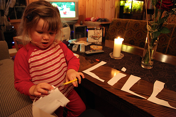 Nu i ettermiddag overraska ho Elena enormt!! Ho e ikkje tre år ennu, men e veldig opptatt av bokstavan. Plutselig kom ho med navnet tell ho mamma Lill! Sirlig utklipt med saksa som ho etter kvært har fått god dreis på. Ikkje dårlig det her!!!
