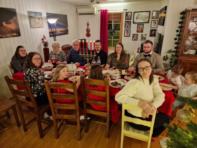 Nyttårsaften 2023-2024; kalkunmiddagen klar til å fortæres. Bak fra venstre: Evelyn, Øystein, Truls, Lotte, Thomas, Elias, Kasper, Cecilie, Sofia, Miriam, Lill og Elena