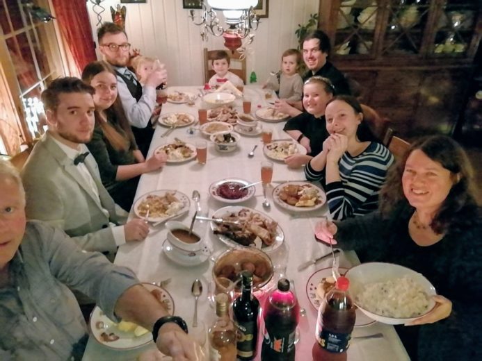 Da var vi igjen samlet til kalkun i Daniel Olaisen vei 29 på Andenes. Thomas med Lotte og lille Miriam, Truls med Cecilie og Bendik (ved enden av bordet) samt lille Sofia. Stian, Elena, Lill og litt av meg… Godt nyttår til dem som ikke var her; Danny og Amalie i Stavanger, samt Fredrik og …