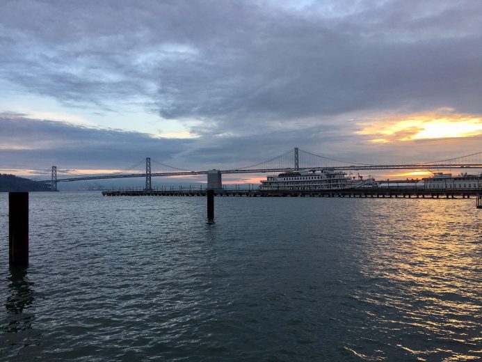 Ikkje akkurat Toften-krysset man ser på før tia mens æ går de 6 km til jobb her i San Francisco. SF baybridge og gamle båta…