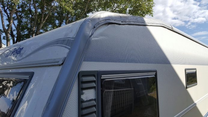 Sånn ser den nye campingvogna vår ut etter at en tulling i lastebil mosa høyre side da han på grunn av altfor stor fart opp svingete Kåringen, måtte bruke en stor del av vårt kjørefelt. Vedkommende fortsatte opp fjellet uten å stoppe, så her må nok kaskoen blø. Hadde det vært noen centimeter til ville …
