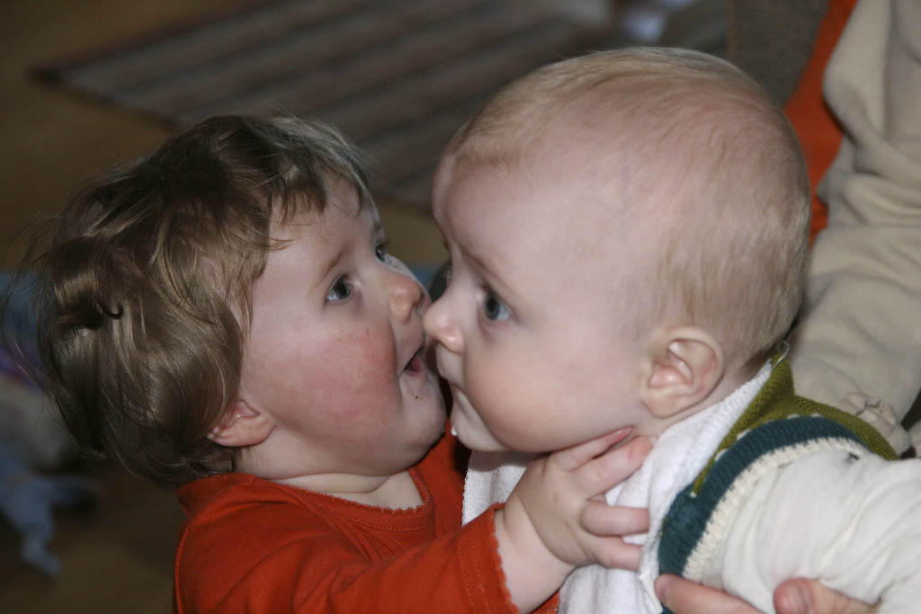 I ettermiddag fikk Elena sjansen til å smaske litt på sitt lille søskenbarn – Håkon, som var på besøk sammen med mamma Silje og mor Evelyn. Elena tok oppgaven MEGET alvorlig som bildet viser!!