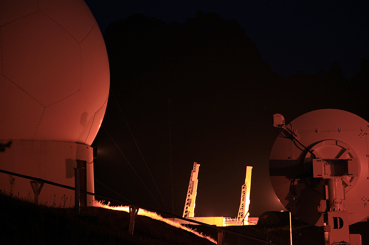 Rett før oppskytninga... 2 svære (20 m lange/5 tonn tunge) raketta på hver sin rampe i Oksebåsen