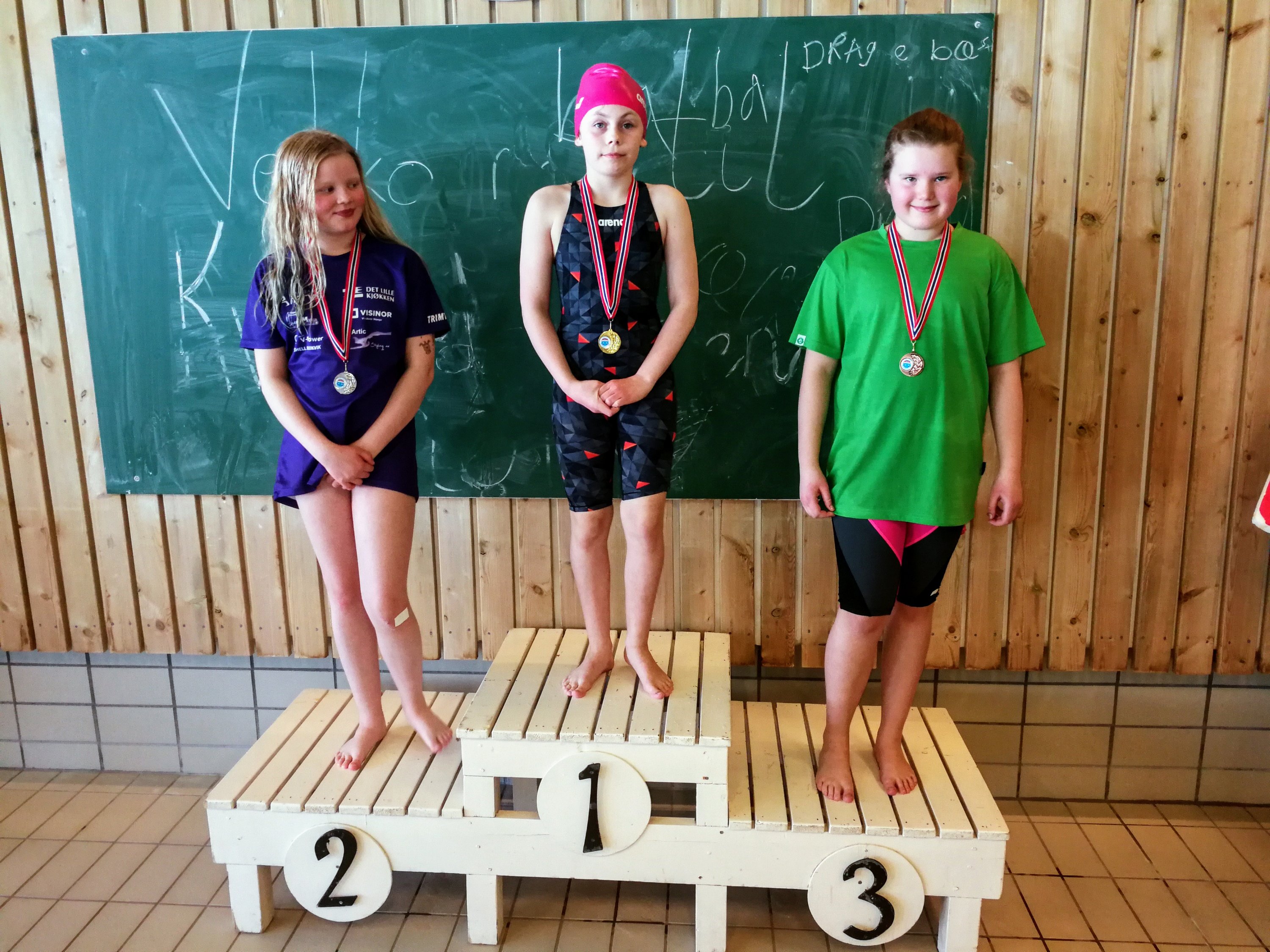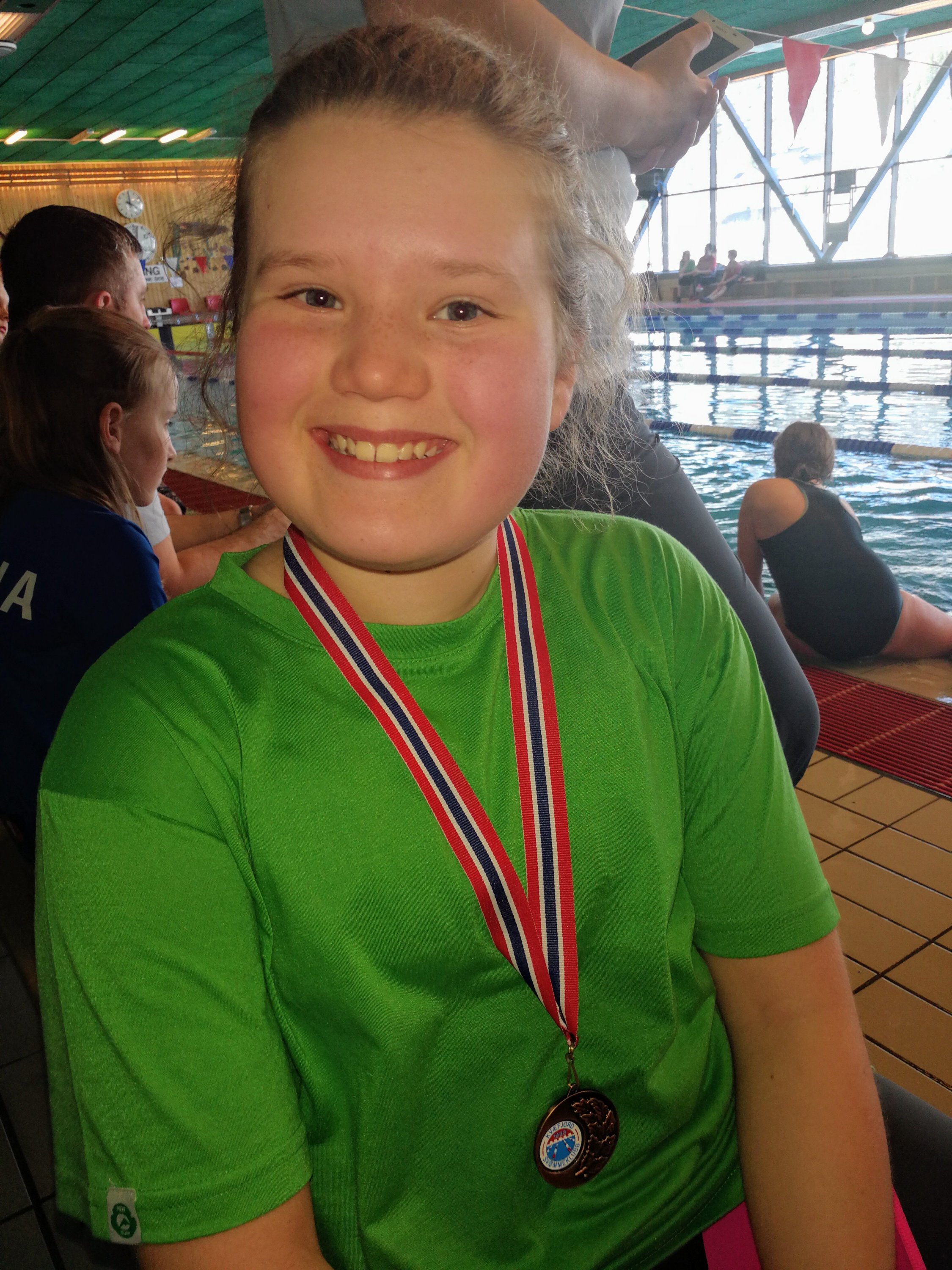 Kvæfjord svømmehall – Elena med 3 plass på 25m fri. Ei meget glad tøtta som i sitt første år i skikkelig konkurranse fikk sin første medalje 🙂
