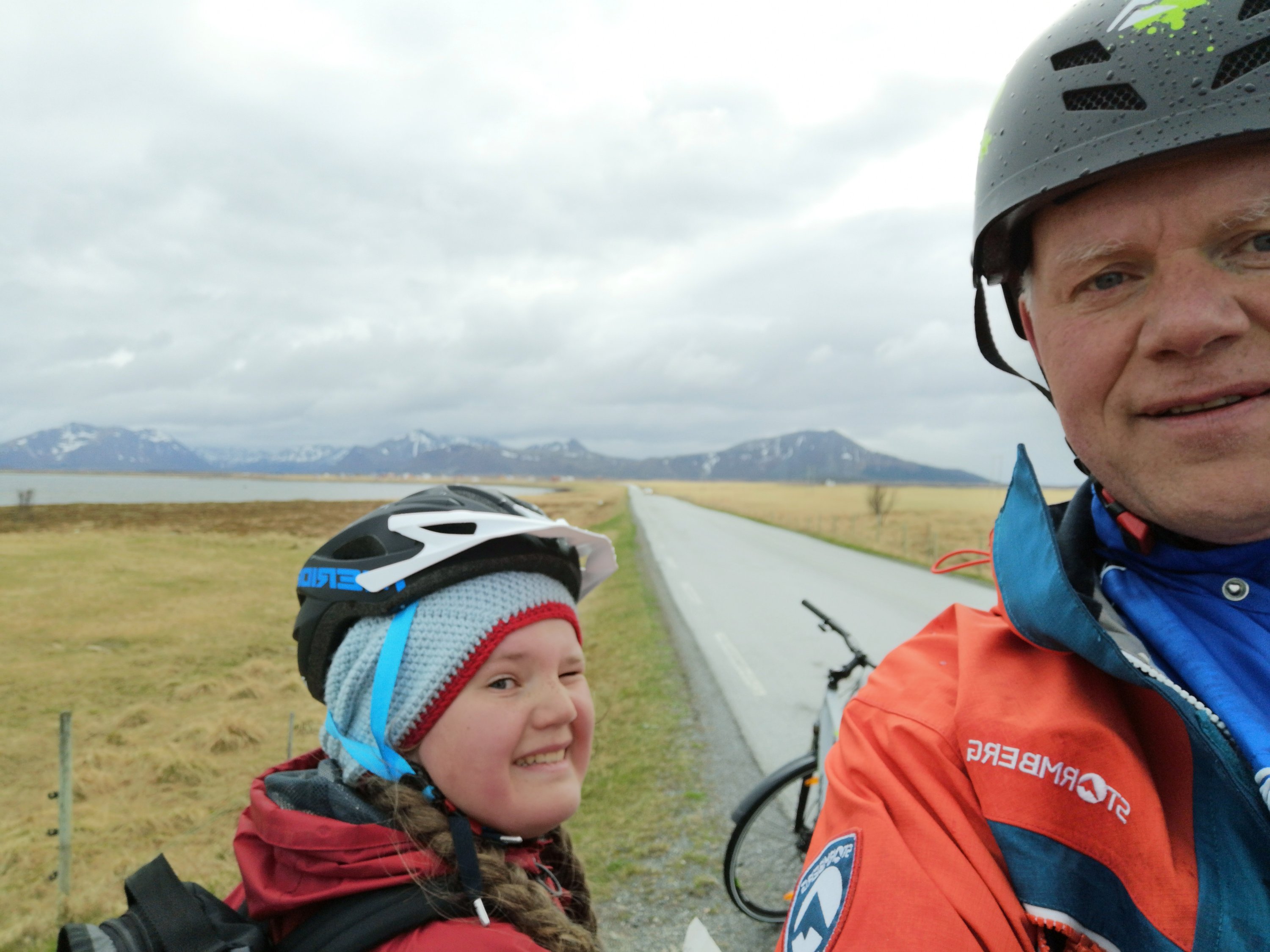 Etter noen uker med mindre, men stadig lengre sykkelturer, er Andøya rundt endelig i gang for Elena og meg. Nå, etter 3.5 timer i regn, hagl og motvind, er vi på Nordmela og nyter lunch, før turen går videre mot Nøss.