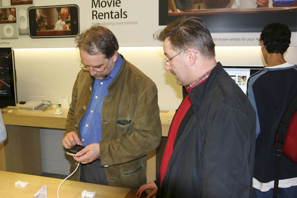 Michael og Kjell beundrer iPhone på Apple-shappa i Pentagon City Mall