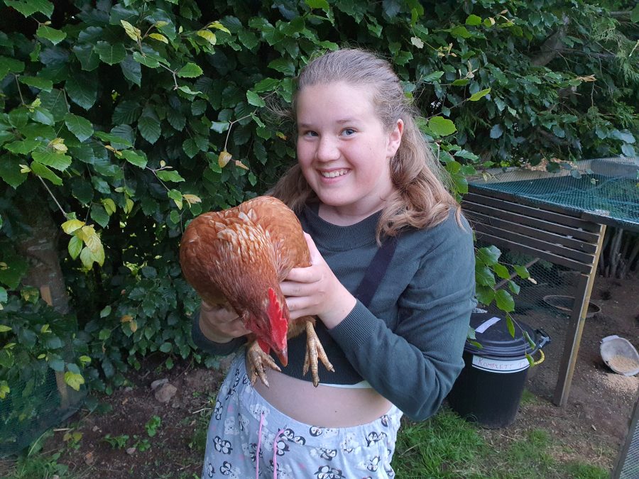 Elena med en av Øyvind og Ann Kristin sine høner i Førde