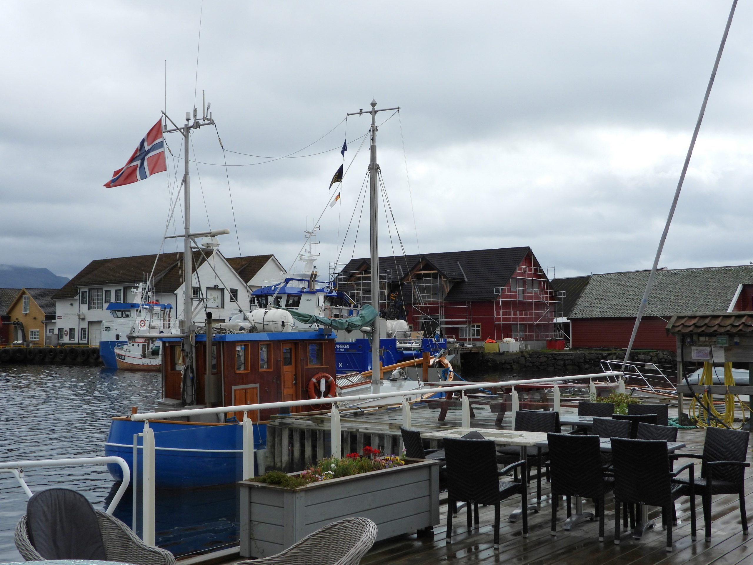 1300 mm zoom fra fjellet over Kalvåg i Bremanger; hus på øya Hovden, hus på øya Skorpa og bakerst øya Alden på Værlandet