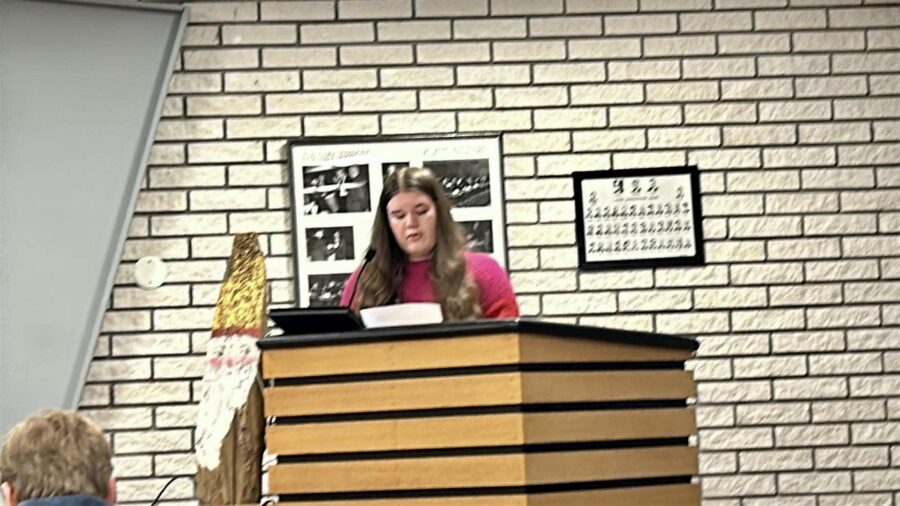 Elena i gang med sitt innlegg i dagens budsjettmøte i kommunestyret som leder av Ungdomsrådet