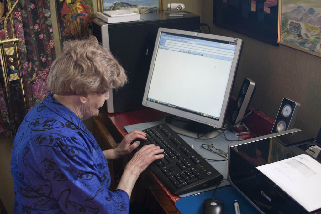 Så kom dagen! Snart 94 år, men på internet skulle ho! Har nu kobla opp ny-maskinen hennes, ADSL-linja og gitt første opplæring i bruk av epost.Sigrid på nett!