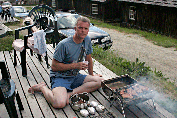 e snart i gang! Derfør detta unntaket kor fotografen faktisk e FRAMFØR kameraet før en gang skyld! Bildet e fra sommerferien i 2006 og e tatt på Nissegården Camping på vei mot Sogn. På campingturan får æ utfolde mæ i grillingens kunst, og bare før å oppklare evt misforståelsa – det e rødvin i plastkoppen 🙂