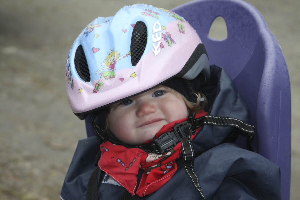 I dag va ho Elena på sin første sykkeltur. Bakpå mamma sin sykkel, i regn og sørvest, men ho kosa sæ  🙂