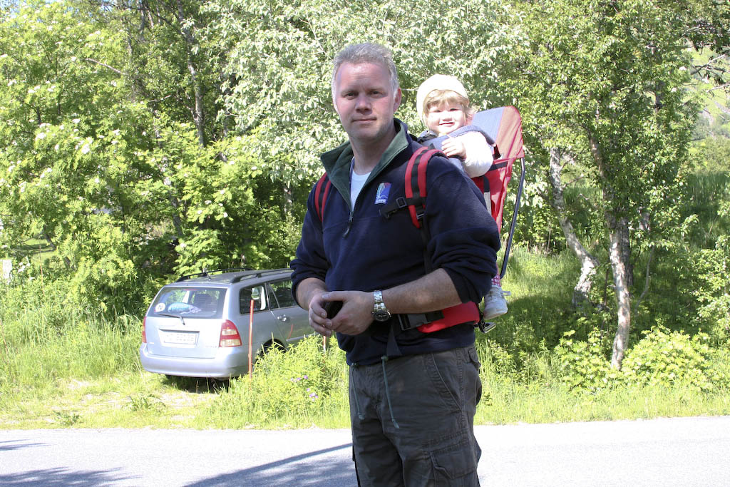 Elena godt plassert i bæremeisen på tur ned tell hytta på Ånes i finværet 🙂