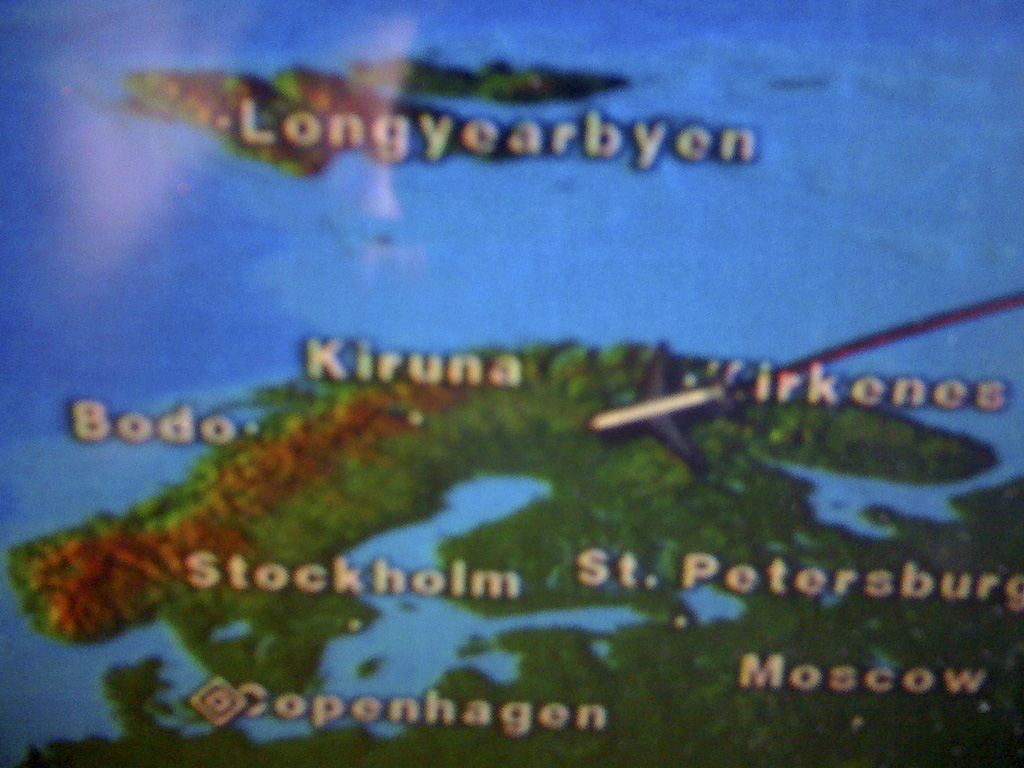 Bildet under e tatt med iPhonen mens vi fløy inn over Scandinavia fra Japan. Vi kom med andre ord nordfra, fra nord-Russland på vei møt Kjøbenhavn kor flybytte tell Olso skulle skje. Derfra bar turen tell Tromsø kor det blei ei overnatting. I dag, den 19.10 e det først ned tell Bodø, så tell Ainnes kor æ e fremme ca 1400. To døgn etter oppstart på reisa fra Tokyo i Japan…