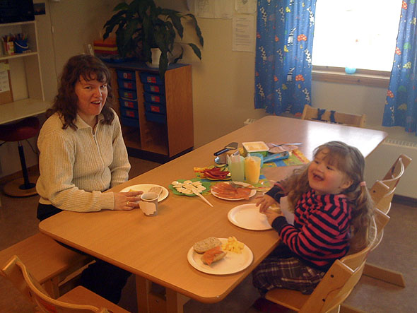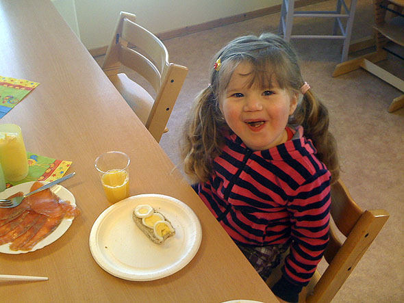 I dag va det dags før årets påskefrokost i Elena sin barnehage – Myrulla. Ho syntes sjøl at detta va stort, at ho mamma og han pappa spiste egg og deilig mat sammen med ho i hennes barnehage. Vi va tidlig ute, så det blei meir folk etter kvært! Deilig mat, god kaffe og en flott start på dagen klokka 8 om morran 🙂
