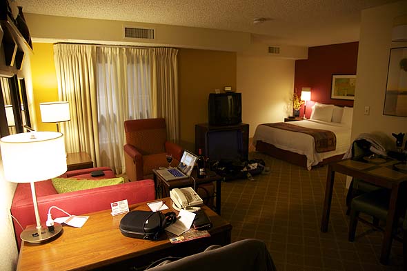 Akkurat ankommet hotellet i Denver. Først vanlig arbeidsdag ved det kanadiske romsenteret, så fly tell Chicago i USA og derfra videre tell Denver. Nu e det litt film (Pirates of the Caribbean) og et glass vin (kanskje to) før senga vente i et ellers nydelig hotellrom.
