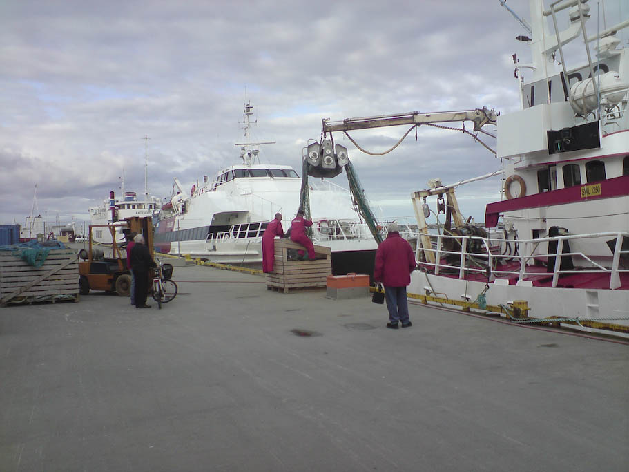 Dagens sykkeltur før Lill, Elena og mæ gikk tell kaia. Der fikk vi tatt den nye kvalsafaribåten – en katamaran, i nærmere øyesyn. Bildet vise både den, den gamle Andfjordferga og feskebåten «Ole Elevan».
