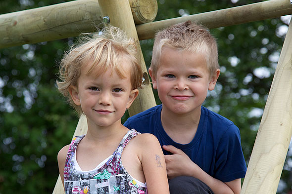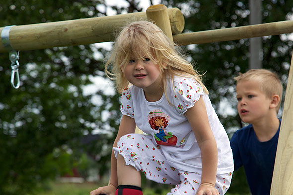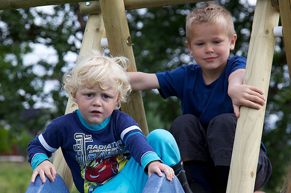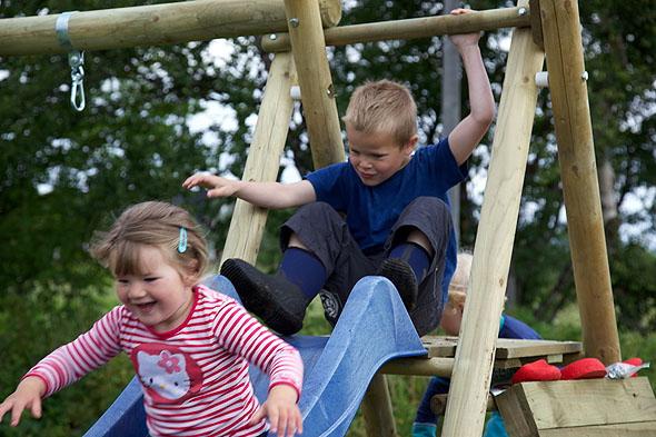 I morrest va ungan tidlig ute før å teste ut den nye sklia og huskestativet som blei satt opp i går: