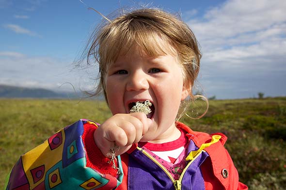 I helga va vi i campingvogna på Dverberg, og da passa det godt med en moltebærtur. Ho Elena plukka molta og spiste reinlav  🙂