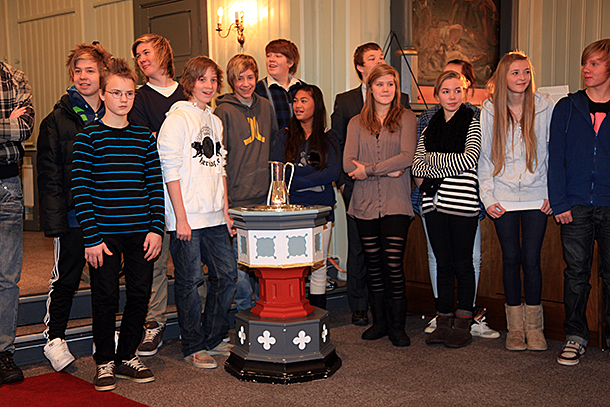 I dag va det som sagt presentasjon av konfirmantan i kjerka. Stian i kvit hettegenser…