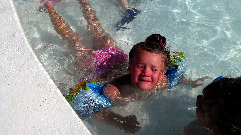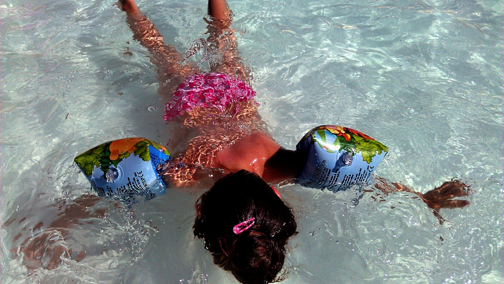 Ho va i vannet i tre tima, omtrent i strekk, og skulle demonstrere dykking og overflatesvømming 🙂
