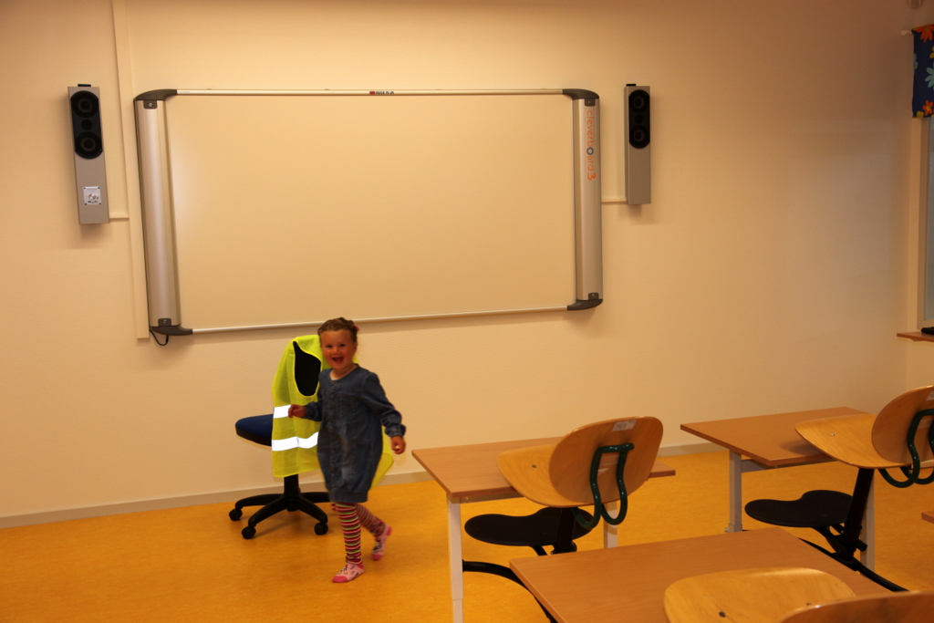 Elena i action i et av SINE spillter nye klasserom med elektroniske tavle. Ho har to år igjen før ho starte, men det betyr INGENTING før ho. Hennes skole e det likevel…