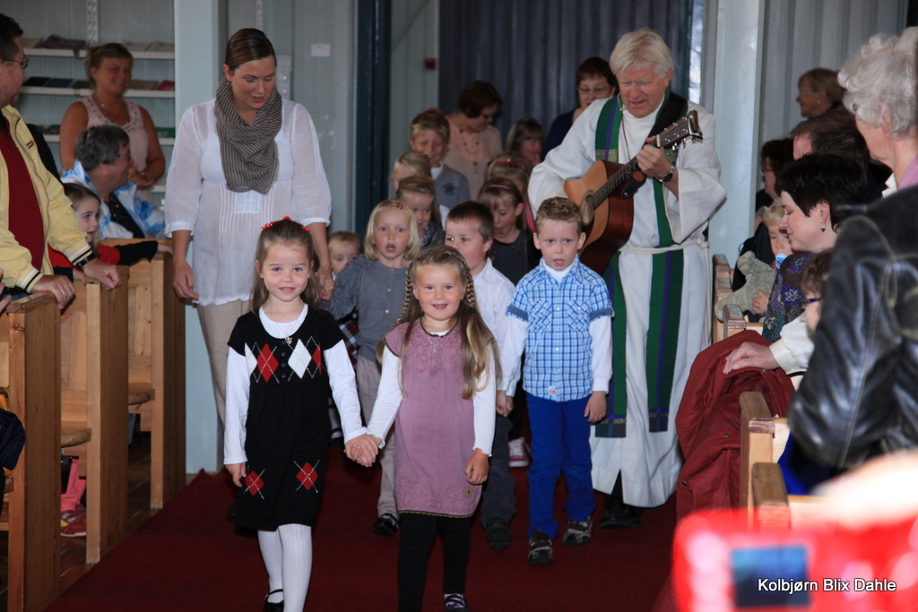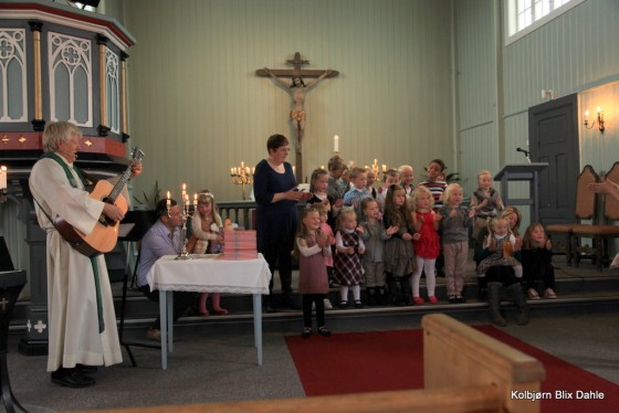 Elena og gjengen i Mini-sing på tur oppover kirkegolvet sammen med prest Gunnar i dag