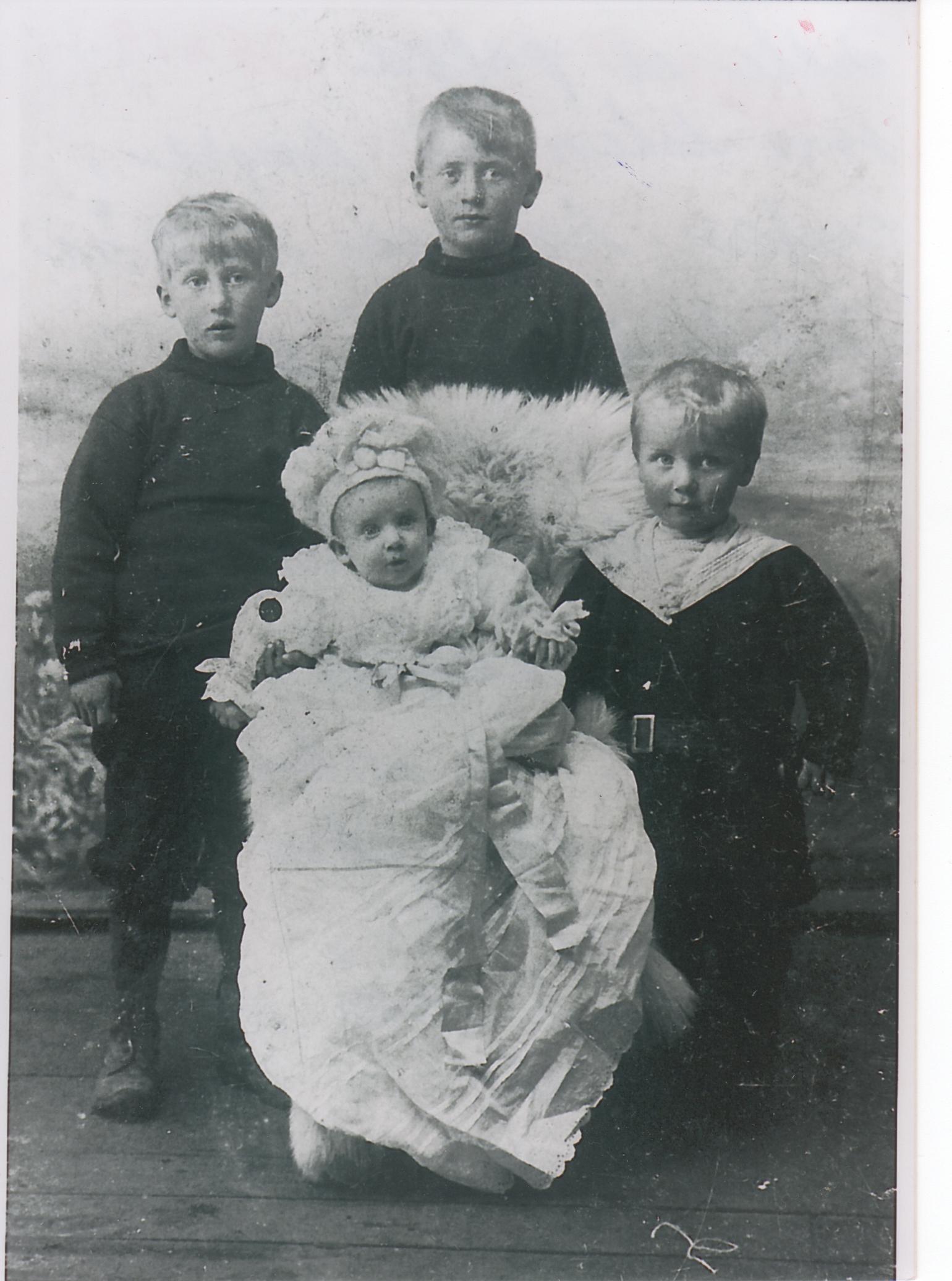 Bilde fra 1910: th Kaare Blix som 2-åring. Babyen er hans bror Torgeir som døde allerde som 19-åring. Bak Kaare ser vi Gerhardt som giftet seg i Brooklyn, New York med Sina Idland. Gerhardt døde i Sandefjord i 1988. Til venstre ser vi Egil som bodde og døde i Gryllefjord (1969). Bildet har jeg fått av min tante Kjærlaug (min mors tvillingsøster).