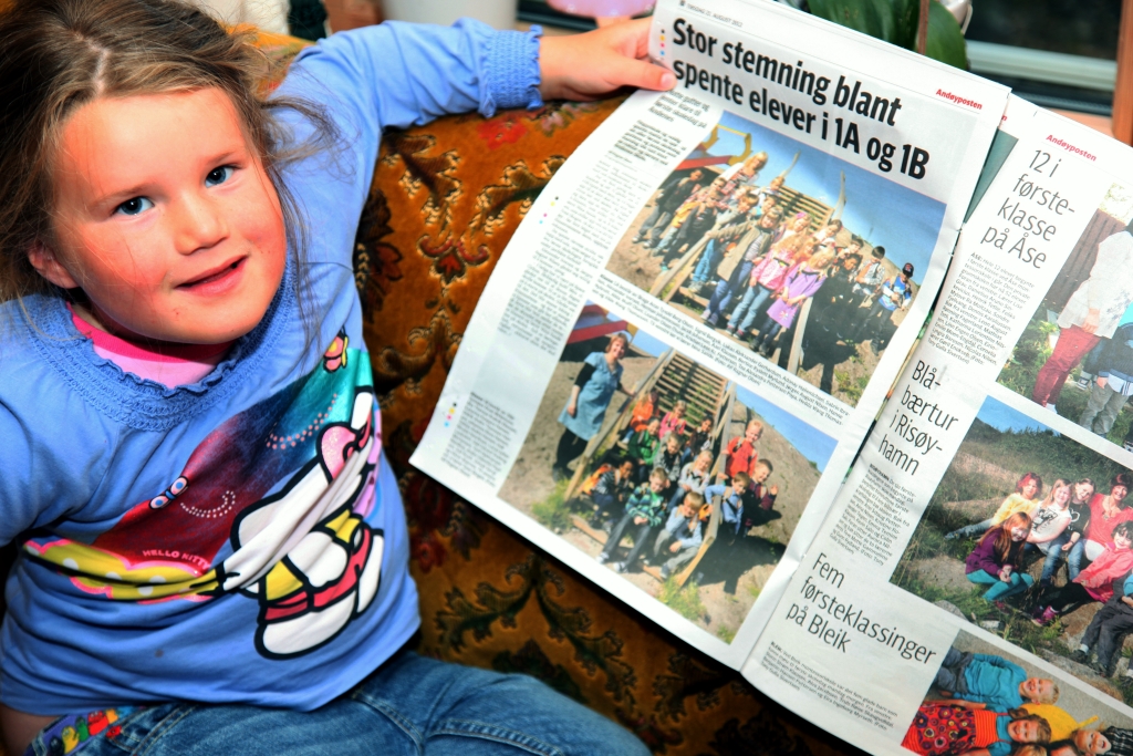 Ho har akkurat starta i Skoleklubben i barnehagen, men lar ikkje det være en showstopper for en titt i avisen kor det jo står om de som har kommet ett skritt lengre…