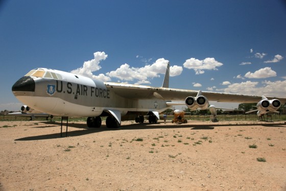 Et av de nyare atombombeflyan – B52 i all sin størrelse. Så stort at de må egne hjul ute på vingan. Fullasta med fuel heng vingan ned og treng den støtten under take-off