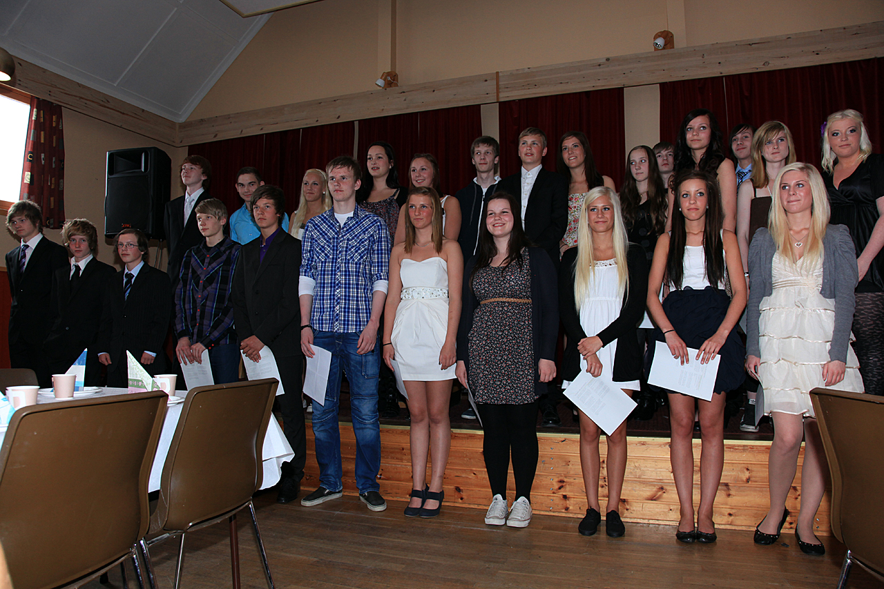 Så va jobben gjort – så langt! 10 år på den skolen alle MÅ ha. Han Fredrik og alle de andre i 10. klasse ved Andenes Ungdomsskole fikk sine vitnemål i går ved en høytidelighet på Forsamlingshuset på Andenes. Klasse 10a og 10b e også de siste som eksamineres ut av den ungdomsskolen som har eksistert sia 1960. Neste gjeng, de som nu e 9a, 9b og 9c skal starte et nytt skoleår på den splitter nye Anndenes Skole som blir en 1-10 skole.
