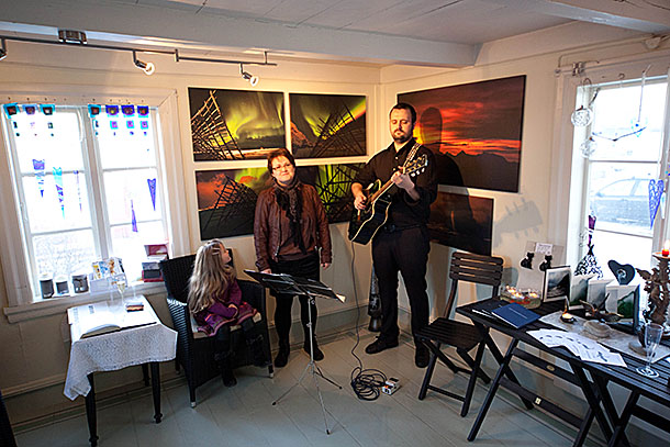 Ho Kirsti og han Øystein bidro med vakker sang ifm dagens store begivenhet – åpninga av mi første fotoutstilling. Sangen som handla om lyset her oppe i nord va skreven av ho Heidi Øygård, mens musikken hadde ho Kirsti sjøl sørga før. Nydelig!!!