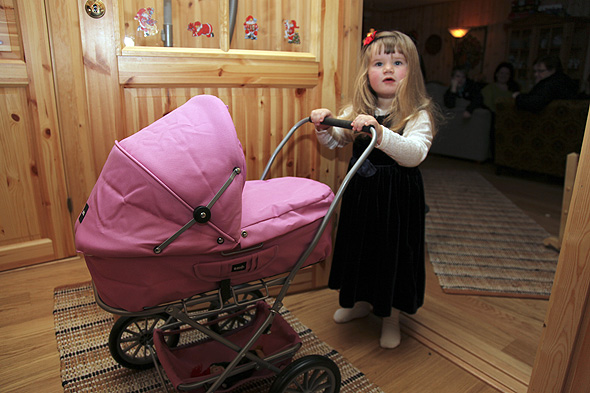 Ho Elena torte å ta imot pakken fra nissen, uten at han pappa holdt ho i handa