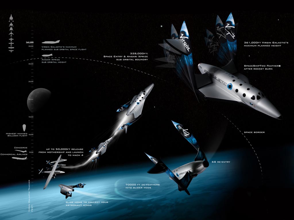 Slik ser det ut når romturistene skal opp til 120 km høyde ved hjelp av Virgin Galactics «White Knight II» og «Spaceship Two» om få år. Illustrasjonen er laget av Virgin Galactic.