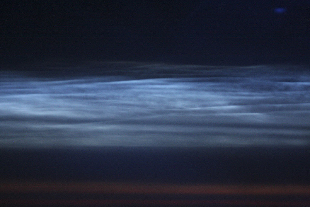 På tur over Atlanterhavet fra Canada, kl. 05.27 den 20. juli tok jeg disse bildene av nattlysende skyer. Bildene er tatt gjennom flyvinduet og er således ikke helt skarpe, men de viser likevel hvor fantastisk flotte disse is-skyene er der de lyser opp nattehimmelen med sitt sølvskimrende lys. HUSK: Dette er skyer som er i 83 km høyde, og derfor 8 ganger høyere enn flyet jeg var med i som lå i ca 10 km høyde. Det ser imidlertid ut til at de er i samme høyde som flyet, men det skyldes bare at de er så mye lengre nord.